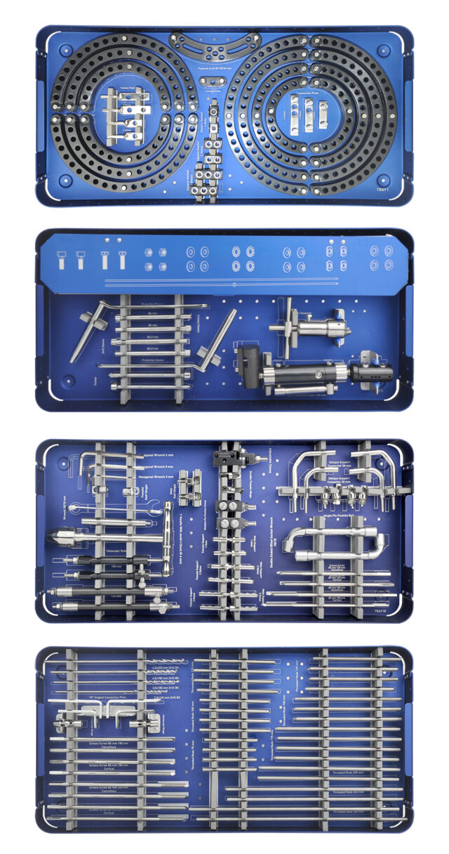 تم تصميم مجموعة أدوات التثبيت الخارجي الدائرية من إليزاروف لزراعة ومعالجة واستخراج إطارات التثبيت الخارجية الدائرية من إليزاروف التي تم تطويرها حول نفس الحلقات والمثبتات والموصلات المستخدمة لتثبيت الكسور المفتوحة المغلقة للعظام الطويلة وتصحيح تشوهات الأطراف الخلقية المكتسبة والعلاج عيوب العظام لدى المرضى البالغين. تحتوي على أكمام ومثاقب وأدلة حفر ومفتاح ربط وقاطع أسلاك وقطع عظمية ومقابض على شكل حرف T وما إلى ذلك