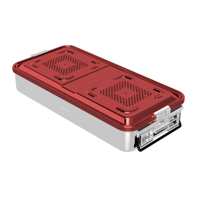 Los contenedores de esterilización de tamaño completo se utilizan para esterilizar, almacenar y transportar implantes a instrumentos quirúrgicos, equipos quirúrgicos y textiles. Consta de dos partes principales: recipiente y tapa. Los cuerpos principales de las cajas y las tapas se prensan en una sola pieza de aluminio de calidad 1050 y no se utilizan soldaduras durante la producción de las cajas y tapas. La anodización decorativa se realiza para aumentar la resistencia de las superficies de la caja y la tapa frente a factores externos. Hay opciones de color en las tapas. Hay orificios para el aire en la superficie de la tapa, un sello de silicona que proporciona un sello de aire y agua en el borde interior, un portafiltros de acero inoxidable / aluminio / plástico con cerradura con un sello de sellado alrededor, que mantiene los filtros colocados en la posición central en el interior de la tapa para filtrar el aire que pasa a través de los orificios de la tapa hacia la caja, cierres de resorte en ambos lados. Hay compartimentos para colocar etiquetas, asas de transporte y piezas de bloqueo a través de las cuales pasa un candado de seguridad desechable de plástico. Estera de silicona, cestas de láminas, cestas de alambre, filtros de papel, filtros de teflón y etiquetas se utilizan como materiales auxiliares junto con los contenedores. Se fabrican en varios tipos y tamaños que están prediseñados según las necesidades de los usuarios. Hay opciones para cajas de orificios y sin orificios y los filtros y los portafiltros utilizados en la tapa se utilizan en las cajas de orificios